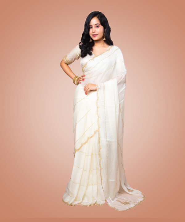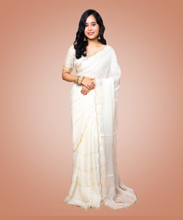 The pristine white color adds a touch of purity and charm, making it ideal for festive occasions, parties, and traditional gatherings. Its subtle appeal allows you to style it with statement jewelry or a contrasting blouse for a modern twist.