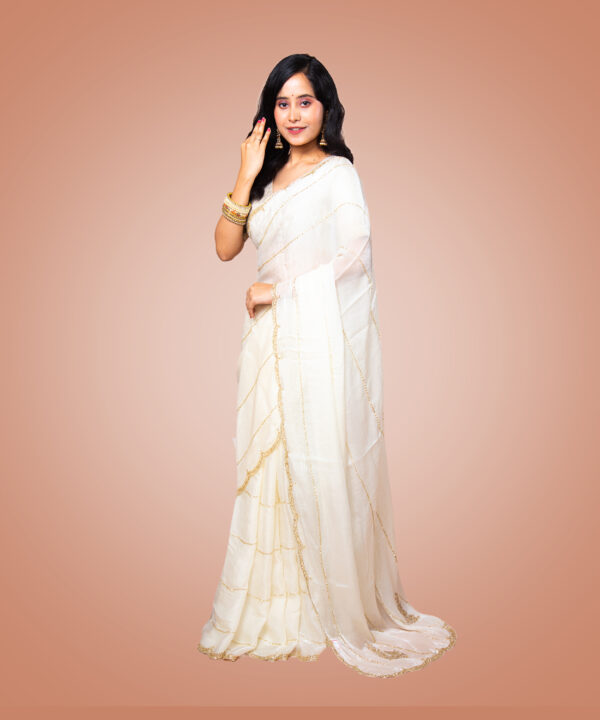 “Kayaaz Women’s Chiffon White Saree With Unstitched Blouse Piece description