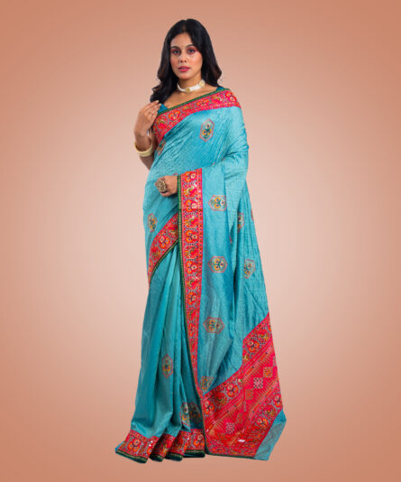 Kayaaz Women's Gujrati Sea Blue Saree With Unstitched Blouse Piece