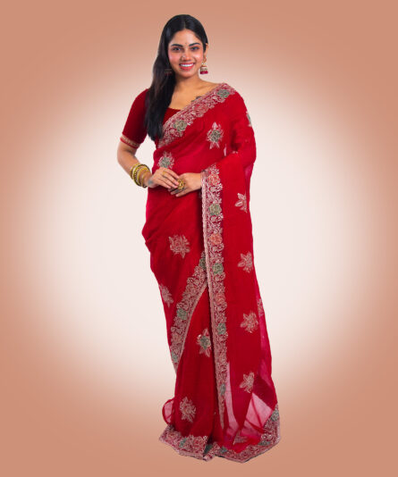 Kayaaz Women's Georgette dep red Saree With Unstitched Blouse Piece
